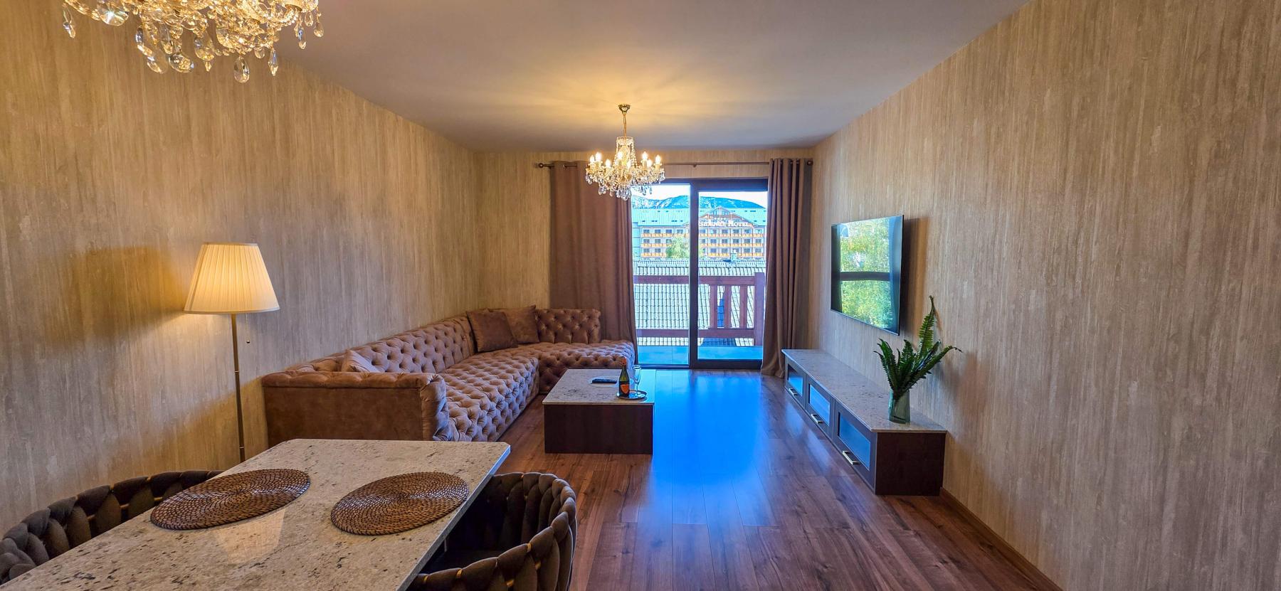 je 3 izbový apartmán, ktorý sa nachádza v hoteli Galileo na 3.poschodí, má 95m2, je vhodný pre 4 osoby, má dve samostatné spáľne, veľkú terasu a výhľad na Novú Hoľu a čiastočne aj na Záhradište.